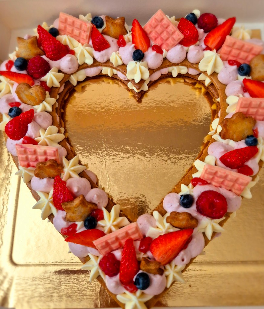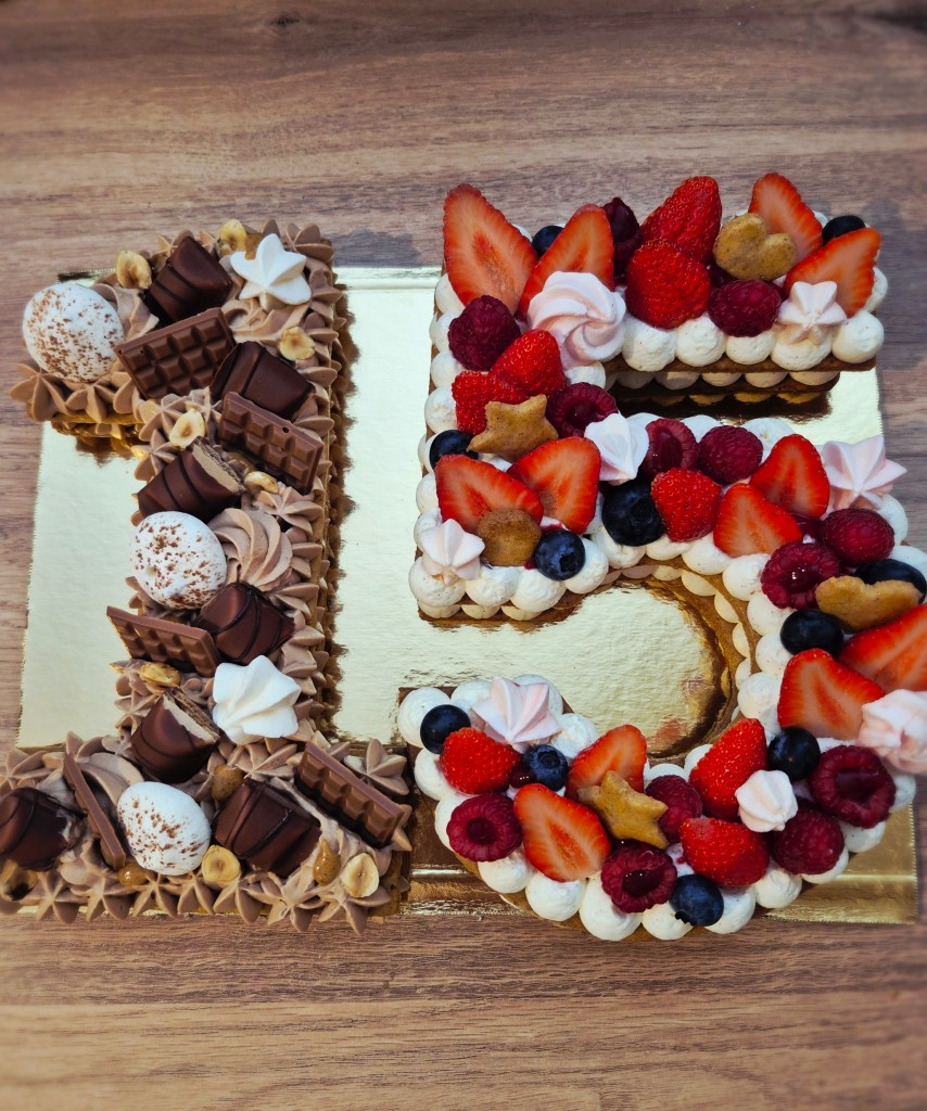 Mon coup de coeur : Le number Cake façon tarte aux fraises (Crème diplomate vanille, confit de framboises, fraises gariguettes, petits sablés et meringues en déco). Idéal pour un goûter d’anniversaire.